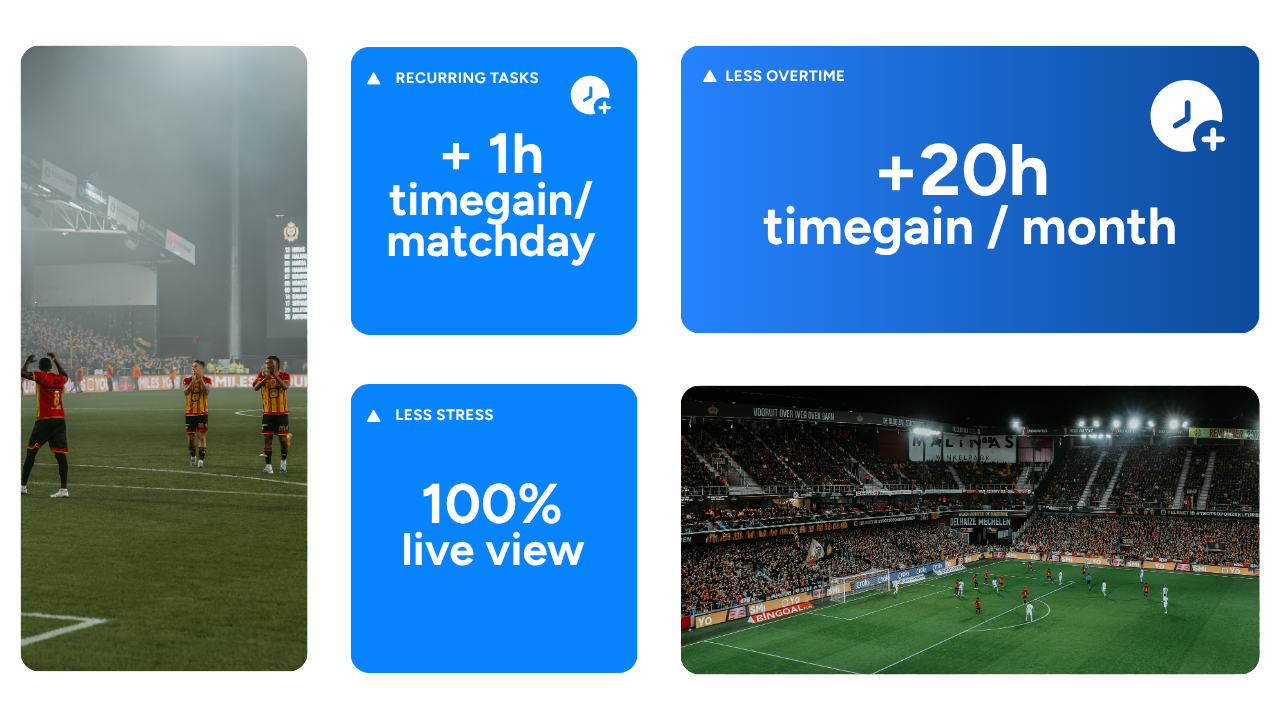 FixForm didn’t just bring structure, it brought peace and control when it matters most: on gamedays. Seppe now saves 4 to 5 hours every week thanks to reduced manual follow-up, and an extra hour per gameday thanks to the automated checklists. Phone calls and WhatsApp messages have been replaced by FixForm. In the command post, a laptop is always open with the FixForm dashboard displayed on a large screen, giving the entire team a live view of who’s working on what, from technical interventions to VIP requests.